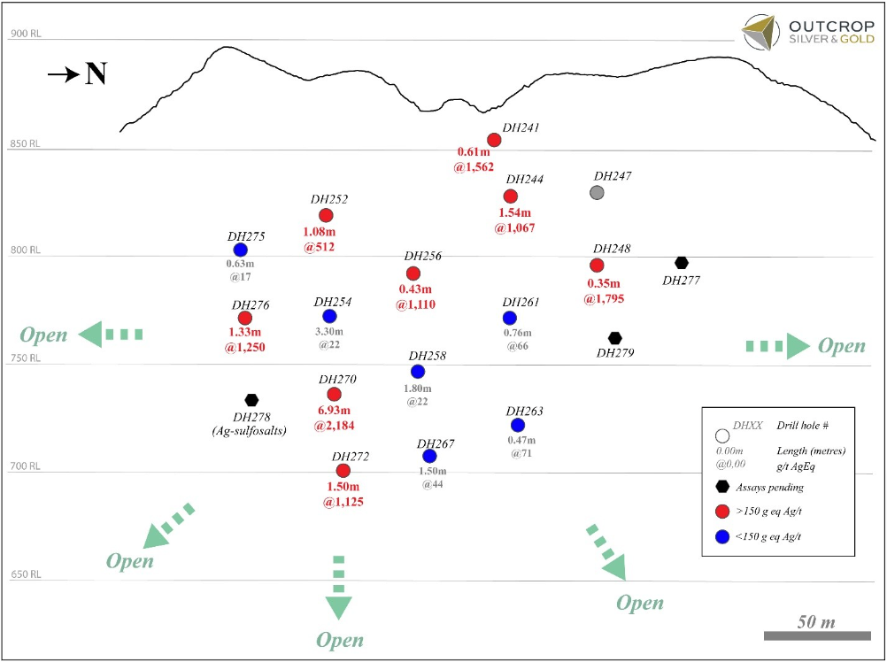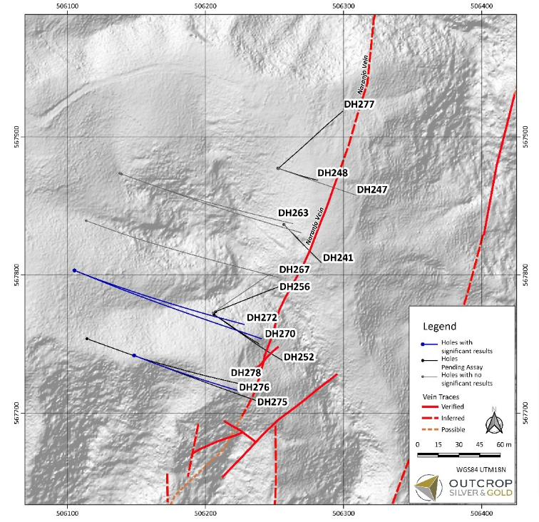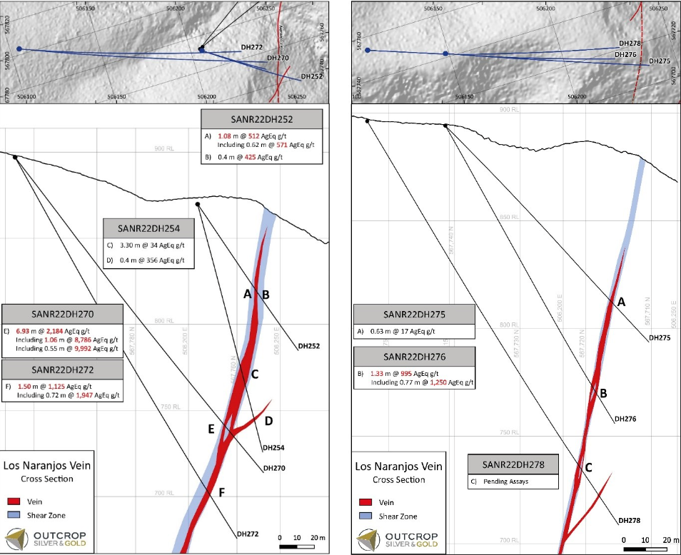 Outcrop Silver & Gold Corporation (TSXV:OCG, OTCQX:OCGSF, DE:MRG1) (“Outcrop”) is pleased to announce the results from three additional drill holes within the Naranjos vein on its 100% owned Santa Ana high-grade silver-gold project in Colombia. Los Naranjos is 350 metres to the northwest of and parallel to the Santa Ana vein system. Los Naranjos shows abundant and locally coarse native silver and electrum (news release July 14, 2022). Los Naranjos is 200 metres wide, extends from the surface to 250 metres depth, and is open in all directions. Eighteen holes have been drilled in Los Naranjos to date; eight have returned high-grade assays, and three holes have pending assays. On a gram x metre basis, the new results from Los Naranjos provide the thickest and highest-grade drill intercept to date on the Santa Ana project.
