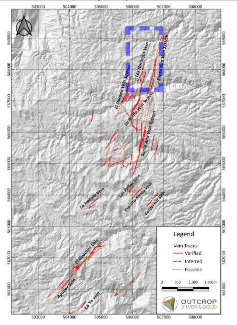At the core Royal Santa Ana project, located at the northern extent of just one of the regional vein systems controlled by Outcrop, thirteen high grade shoots have been discovered – La Ivana hanging-wall and footwall (La Porfia vein system); San Antonio, Roberto Tovar, San Juan, Las Maras (Royal Santa Ana vein systems); El Dorado, La Abeja (El Dorado vein systems); Megapozo, Paraiso (El Paraiso vein system); Espiritu Santo (Aguilar vein system); La Isabela and Los Naranjos. Each zone commonly contains multiple parallel veins. The veins can show both high-grade silver and high-grade gold mineralization and low angle veins appear to connect more common high angle veins.