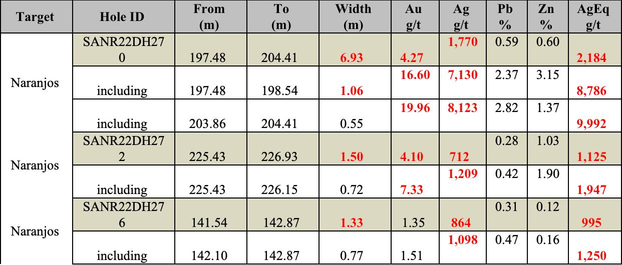 “We are incredibly pleased with our recent results from Naranjos,” commented Guillermo Hernandez, Vice President of Exploration. “We believe mineralization can be expanded significantly along the surface and at depth. Intercepts pending assay show locally abundant silver-sulfosalts in core, indicating Naranjos will continue to provide high-grade assays.”