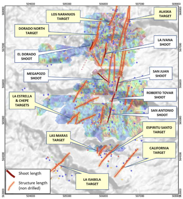 Figure 1. Map showing inferred veins within a 2.5-km radius of the historic Santa Ana mines. The veins are in red and the length of known shoots in burgundy. The shoots are labeled with white callouts and the near-term drilling targets with yellow callouts.