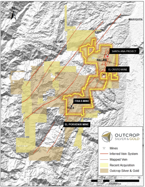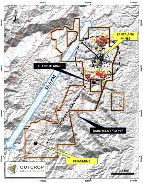 Outcrop drilling indicates that mineralization extends from surface or near surface to depths of at least 300 metres. Cumulatively, over 60 kilometres of mapped and inferred vein zones occur on the Santa Ana project. The Frias Mine on the south-central part of the project, 12 kilometres south of the Royal Santa Ana Mines produced 7.8 million ounces of silver post-production in the Spanish colonial era at a recovered grade of 1.3 kg Ag/t. The Frias Mine is considered an analogue to each of the seven shoots discovered to date by Outcrop. Outcrop has advanced numerous target areas to the north, including north Eldorado that comprises the northern extension of seven Royal Santa Ana veins for over 1 kilometre. The north Eldorado shows high values over 3.0 kg Ag/t. Between the Royal Santa Ana mines and Frias, veins have been extended 2.8 kilometres to the south providing strong drill targets in the Espiritu Santo, Maras, and El Christo veins that show high values up to 5.5 kg AgEq/t. These veins show widths up to 2.8 to 4.0 metres.