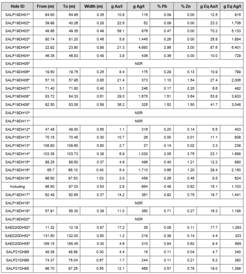 For equivalent calculations $1,900 per ounce gold, $26 per ounce silver, $0.87 per pound lead and $1.08 per pound zinc were used. Intervals shown are drill intercept, true thickness cannot be calculated yet. *Previously reported drill-holes. Drill holes 52 and 55 targeted El Dorado and intercepted La Ivana at depth. Delineation drilling of La Ivana commenced with drill hole 86.