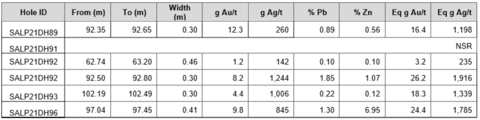 • 0.41 metres of 24.4 grams gold equivalent per tonne or 1,785 grams silver equivalent per tonne.