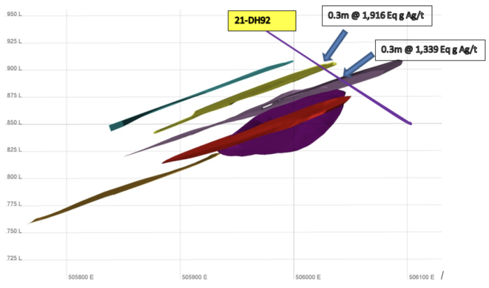Section 1: La Ivana consists of a complex of six stacked, parallel vein segments that extend downdip 350 metres. DH 92 intercepted two distinct stacked parallel veins 25 metres apart. The vein segments add significant potential to the La Ivana shoot. The location for 21-DH92 and its intercepts are approximate for illustration purposes.