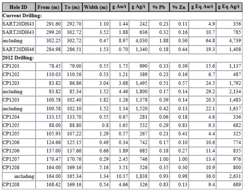 For equivalent calculations $1,900 per ounce gold, $26 per ounce silver, $0.87 per pound lead and $1.08 per pound zinc were used. Intervals shown are drill intercept, true thickness are not yet calculated. Roberto Tovar holes CP1201 through CP1208 are historic holes drilled in 2012 but shown for context of current drilling. Drill holes 41, 42, 44, and 45 did not have significant intercepts defined as 200 g eq Ag/t. Hole 40 encountered 2.25 metres of historic workings.