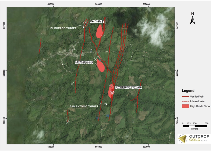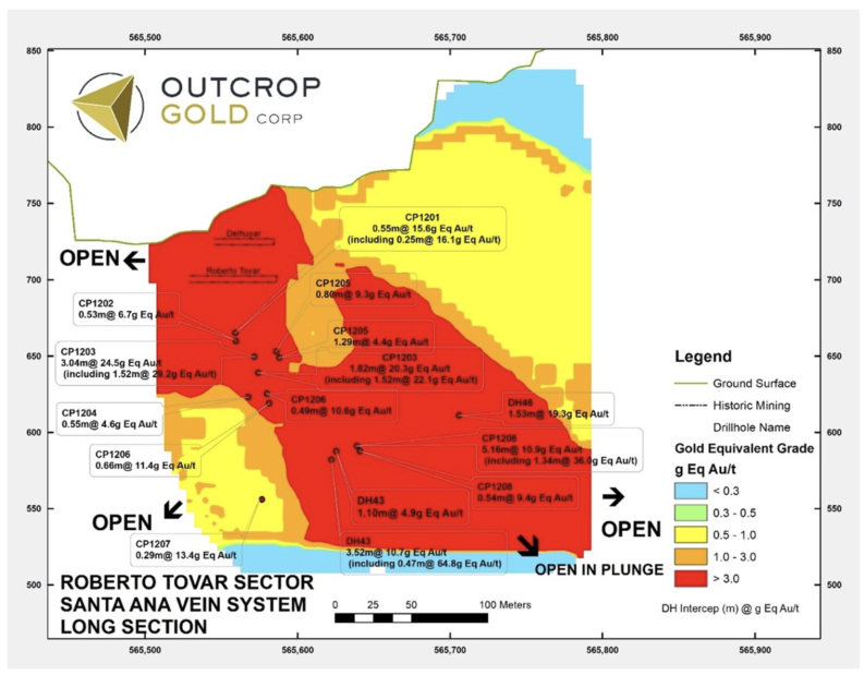 “Outcrop continues to be impressed with the exceptional size and grade continuity of the three high-grade shoots discovered to date on Santa Ana”, commented Joe Hebert, Chief Executive Officer. “ All three high-grade shoots are open in two or more directions and show vein and grade continuity well below 300 metres down dip for both low and high-angle veins and remain open at depth.”