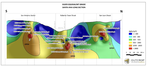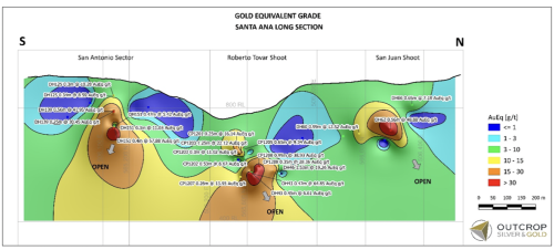 - If San Antonio merges with two adjacent open shoots, cumulatively Santa Ana will contain 2 kilometres of mineralized vein strike distributed within six large high-grade shoots. All shoots open along strike all are open at depths of 200 metres or more.