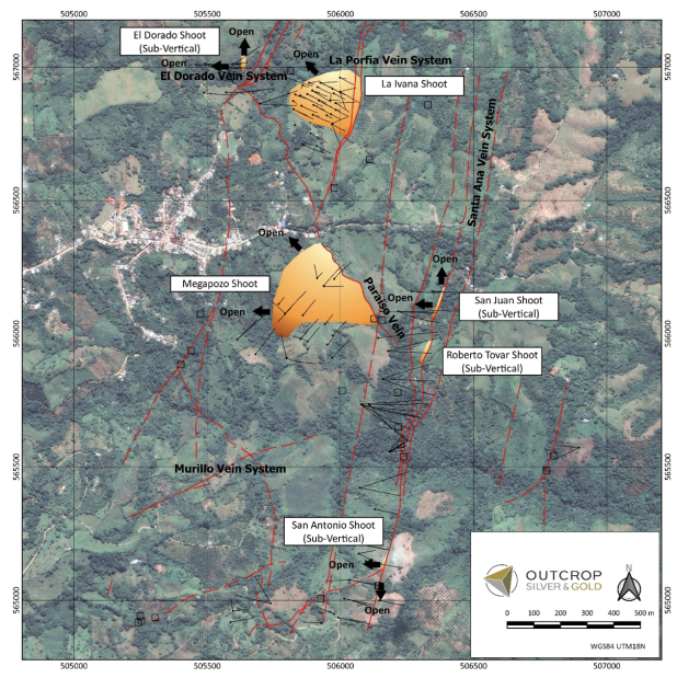 At the core Santa Ana project, located at the northern extent of just one of the regional vein systems controlled by Outcrop, at least twelve principle vein zones are recognized that cumulatively provide up to 14 kilometres of cumulative strike length – La Ivana (La Porfia vein system), Roberto Tovar (Royal Mines, including the Santa Ana, Delhuyar and Roberto Tovar vein systems), San Juan (Santa Ana and Delhuyar vein systems), El Dorado (El Dorado and El Paraiso vein systems), Morales, Pollera, Guanabanera, San Antonio (Santa Ana vein system), Palomos, Murillo, Culebra and Megapozo (El Paraiso vein system). Each zone commonly contains multiple parallel veins. The veins can show both high-grade silver and high-grade gold mineralization and may be both low and high angle depending on local controls. Drilling indicates that mineralization extends from surface or near surface to depths of at least 350 metres locally.
