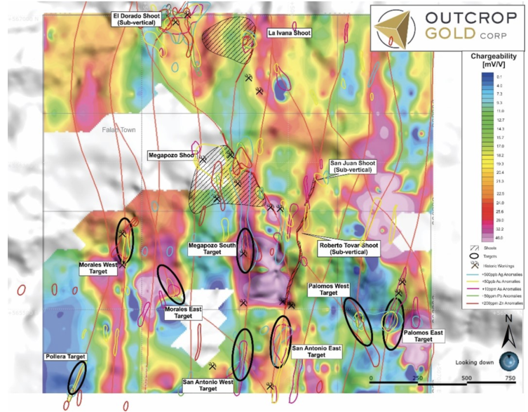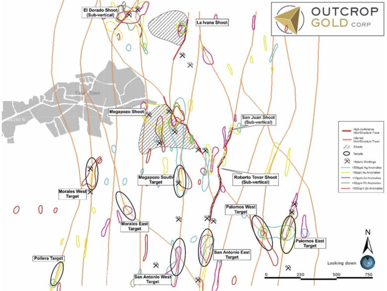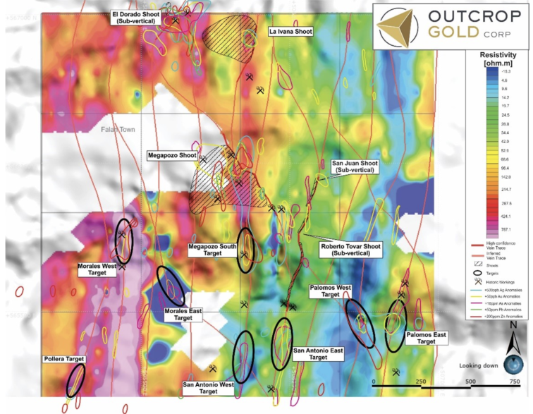 “Outcrop is excited with the results from its ground geophysics on Santa Ana”, comments Joe Hebert President and CEO of Outcrop. “Considering our one hundred percent success rate on all tested targets producing large high-grade shoots, we are confident that some of these targets will deliver new shoots. In exploration, the adage that “structure is everything” is true, and with gradient array IP/Resistivity we have enhanced our ability to map vein structures and correlate them with other soils and trench anomalies to generate multiple new targets.”