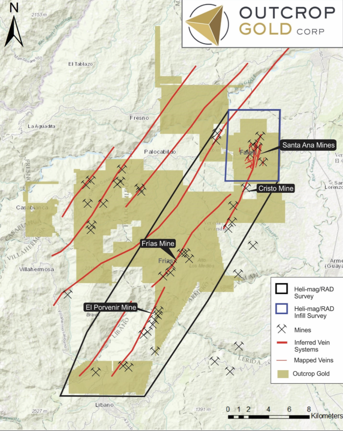 January 26, 2021 – Vancouver, BC – Outcrop Gold Corp. (TSXV:OCG, OTCPK:MRDD.F, DE:MRG1) (“Outcrop”) is pleased to announce results from a ground geophysical program on its 100% owned Santa Ana project in north Tolima. Outcrop is also commencing a large airborne geophysical survey along a 36 km northeast mineralized trend between the Santa Ana and El Porvenir mines with a flight line width of 10 kilometres.