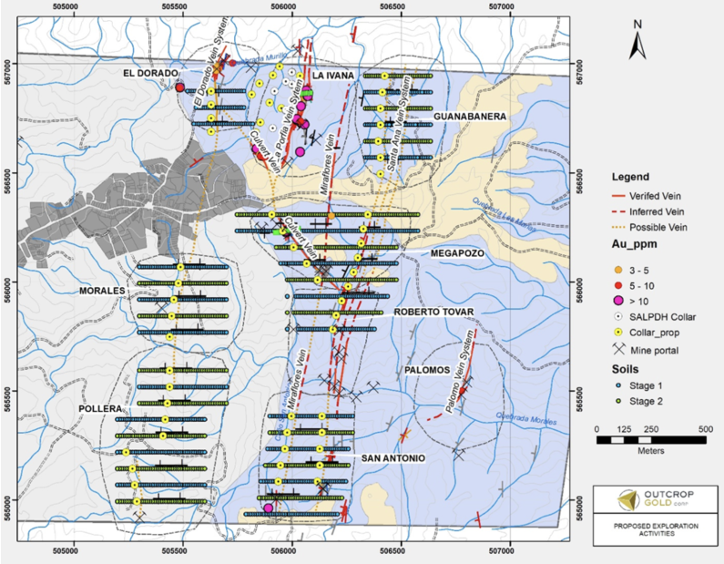 Outcrop has defined nine core target areas on the project, named La Ivana, El Dorado, Megapozo, Morales, Pollera, Guanabanera, Roberto Tovar, San Antonio, and Palomos. The vein system consists of north-northeast trending veins, linked by northwest trending veins. Detailed soil sampling and trenching is expected to reveal the general limits of ore-shoots to guide drilling. Later in the summer and fall Outcrop will begin reconnaissance prospecting on nearby Company owned mining title applications- additional vein zones are expected to be identified by this work. The objective of this reconnaissance prospecting will be to identify and or secure vein zones with a cumulative extent of at least 14 km within the Mariquita District- with all vein zones close enough to Santa Ana comprise one consolidated project.