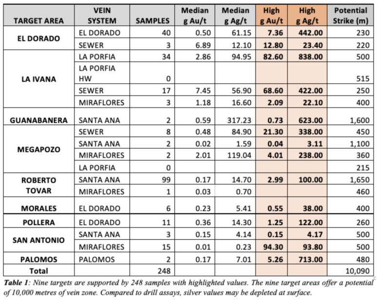 There are strong suggestions that silver is mobile and that silver values are commonly attenuated in the oxide zone at surface – and in many cases silver values will be higher in unoxidized veins. This is suggested in drilling at the La Ivana and Roberto Tovar targets – where surface samples show lower average values than drill assays.