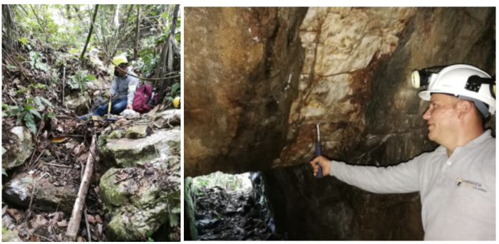 Photo 2 and 3: Newly discovered outcropping vein and workings in the Morales target.