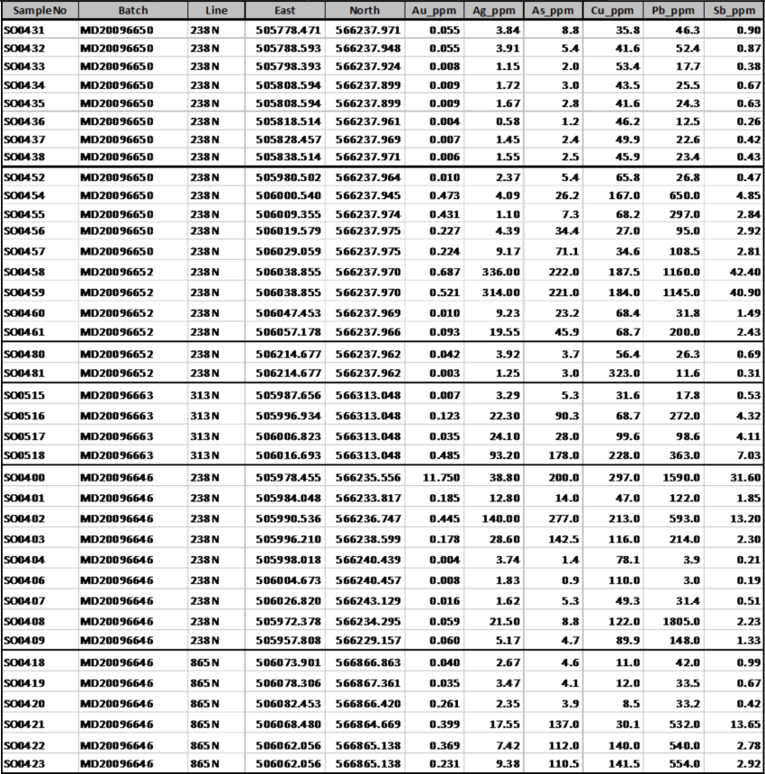 Table 1: Soil anomalies are reflected in gold and silver, and associated trace elements of arsenic, copper, lead and antimony.