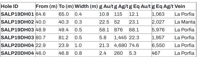 The La Ivana vein system includes the La Porfia, La Manta and Guanabana veins. In the La Porfia vein, the average downhole intercept length is 0.58 m with weighted average grades of 18.9 g Au/t and 2,122 g Ag/t – for a weighted average gold equivalent grade of 58.7 g Eq Au/t and a weighted average silver equivalent grade of 5,154 g Eq Ag/t.