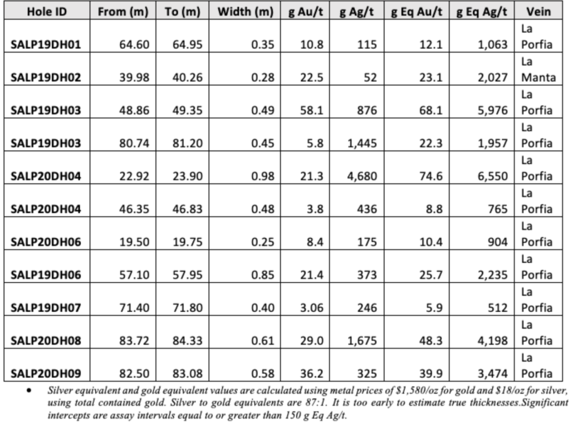 During Phase 1 the Company discovered a new high-grade gold and silver vein system, at La Ivana (News Release dated March 2, 2020). La Ivana had never been drilled before and for the nine holes reported in that Phase 1 the average downhole intercept length is 0.52 m with a weighted average grade of 21.7 g Au/t and 1,329 g Ag/t. The weighted average for equivalent gold is 36.9 g Eq Au/t and the weighted average for equivalent silver is 3,224 Eq Ag/t. With highlights including: