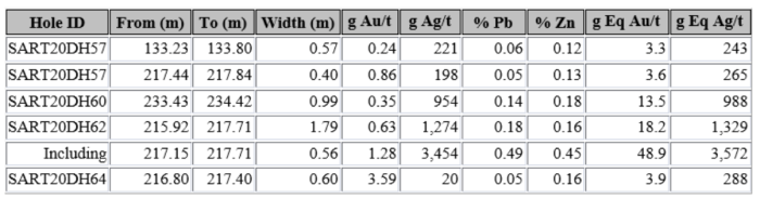 For equivalent calculations $1,900 per ounce gold, $26 per ounce silver, $0.87 per pound lead and $1.08 per pound zinc were used. Intervals shown are drill intercept, true thickness are not yet calculated. Drill holes 49, 51, 53, and 54 did not have significant intercepts defined as 200 g eq Ag/t.