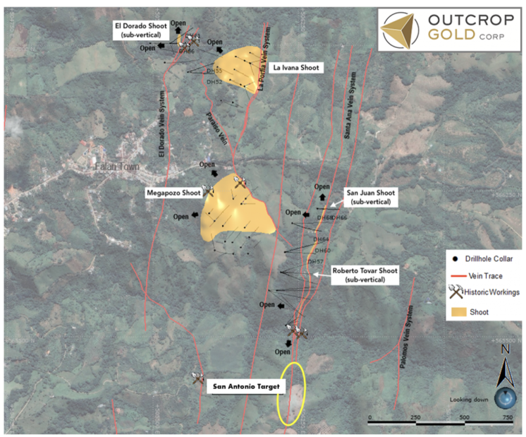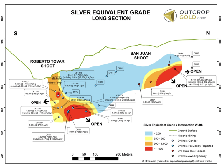 “San Juan is the fifth high-grade shoot discovered at Santa Ana in twelve months,” commented Joe Hebert, Chief Executive Officer. “Exploration at Santa Ana has been very efficient producing a high-grade shoot on average for every 2,100 metres of drilling. More importantly, San Juan represents a unique exploration opportunity being that it is a blind discovery made by drilling below shallow anomalous shears near an adjacent known shoot. Outcrop is working to develop geochemical and structural vectors to blind mineralization.”
