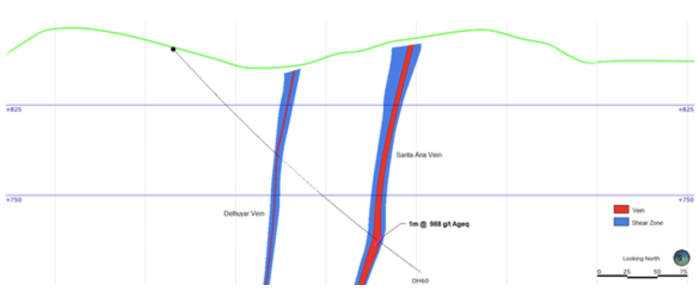 Section 2: Discovery hole 60 intersecting San Juan shoot 150 metres below surface. The Santa Ana vein is the primary vein and Delhuyar secondary vein within “package”. The secondary veins can be strongly mineralized locally.