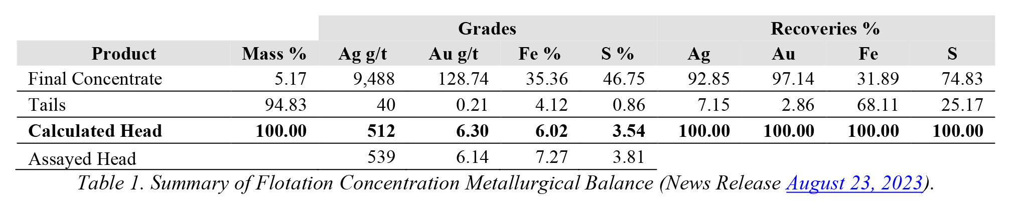 The results of the final locked cycle flotation metallurgical balance for sample PAR-02 demonstrated exceptional recovery rate, achieving 97.14% for gold and 92.85% for silver (Table 1), This process produced a high-grade concentrate grading of 128.74 grams per tonne of gold and 9,488 grams per tonne of silver (see News Release dated August 23, 2023).