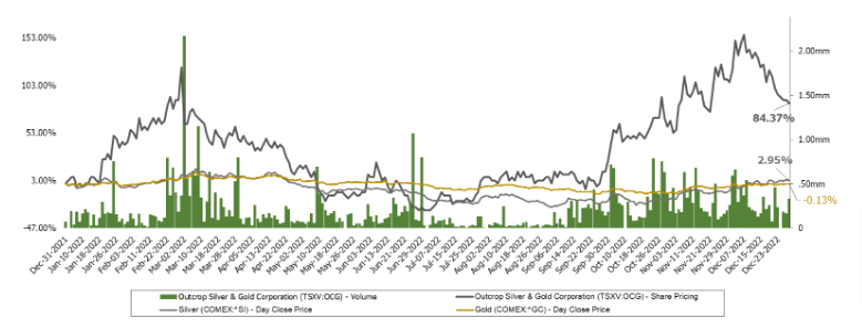 Outcrop Silver & Gold trailing twelve months trading price & volume ended on December 30, 2022, compared with gold & silver price