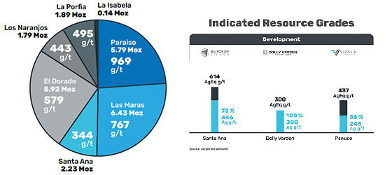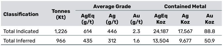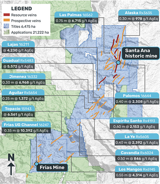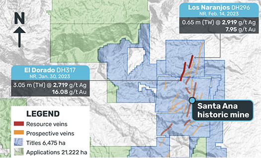 Santa Ana maiden resource estimate contains an estimated indicated resource of 24.2 million ounces silver equivalent at a grade of 614 grams per tonne silver equivalent and an inferred mineral resource of 13.5 million ounces silver equivalent at a grade of 435 grams per tonne silver equivalent, based on the NI 43-101 Technical Report titled “Santa Ana Property Mineral Resource Estimate,” dated June 8, 2023, and prepared by AMC Mining Consultants. The resource is comprised of the seven vein systems (commonly containing multiple parallel veins and multiple ore shoots) discovered to date – Santa Ana (San Antonio, Roberto Tovar, San Juan shoots); La Porfia (La Ivana); El Dorado (El Dorado, La Abeja shoots); Paraiso (Megapozo); Las Maras; Los Naranjos and La Isabela.