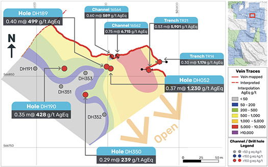 Las Abejas Shoot at El Dorado Vein: Drill hole DH317 revealed a remarkable intercept of 5.28 meters (true width of 3.05 meters) containing 16.08 g/t gold and 2,719 g/t silver.