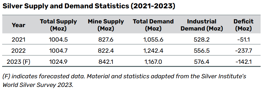 Statistics from the Silver Institute’s World Silver Survey 2023 paint a clear picture of this emerging trend with an estimated 12% deficit in supply versus demand. Over the last three years, the total deficit is estimated at 431 million ounces of silver. This amount is staggering, equating to approximately 4.5 months of the entire world supply of silver, or around 6 months of the entire world supply of silver from all mines. This significant deficit underscores the urgency and potential for silver price appreciation.