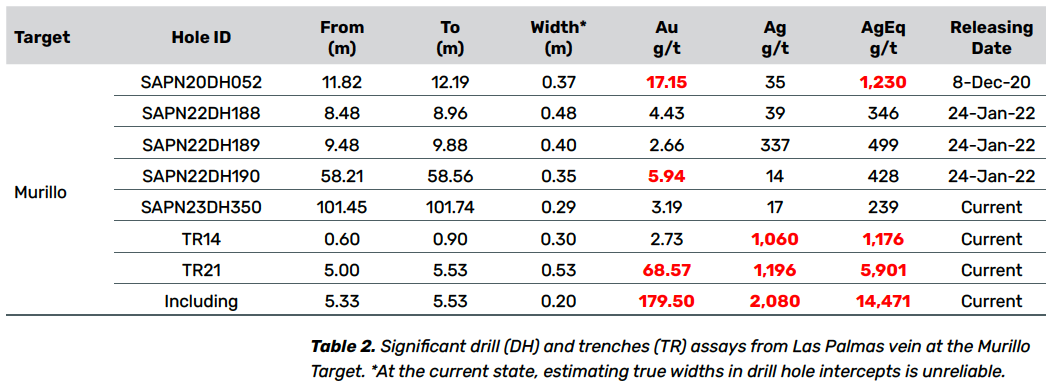 Los Naranjos Vein: Drill hole DH296 encountered an intercept of 0.89 meters (true width of 0.65 meters) with an impressive concentration of 7.95 g/t gold and 2,919 g/t silver.