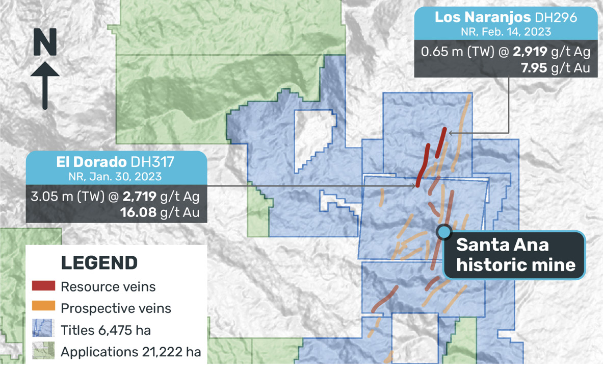 Santa Ana maiden resource estimate contains an estimated indicated resource of 24.2 million ounces silver equivalent at a grade of 614 grams per tonne silver equivalent and an inferred mineral resource of 13.5 million ounces silver equivalent at a grade of 435 grams per tonne silver equivalent, based on the NI 43-101 Technical Report titled “Santa Ana Property Mineral Resource Estimate,” dated June 8, 2023, and prepared by AMC Mining Consultants. The resource is comprised of the seven vein systems (commonly containing multiple parallel veins and multiple ore shoots) discovered to date – Santa Ana (San Antonio, Roberto Tovar, San Juan shoots); La Porfia (La Ivana); El Dorado (El Dorado, La Abeja shoots); Paraiso (Megapozo); Las Maras; Los Naranjos and La Isabela.