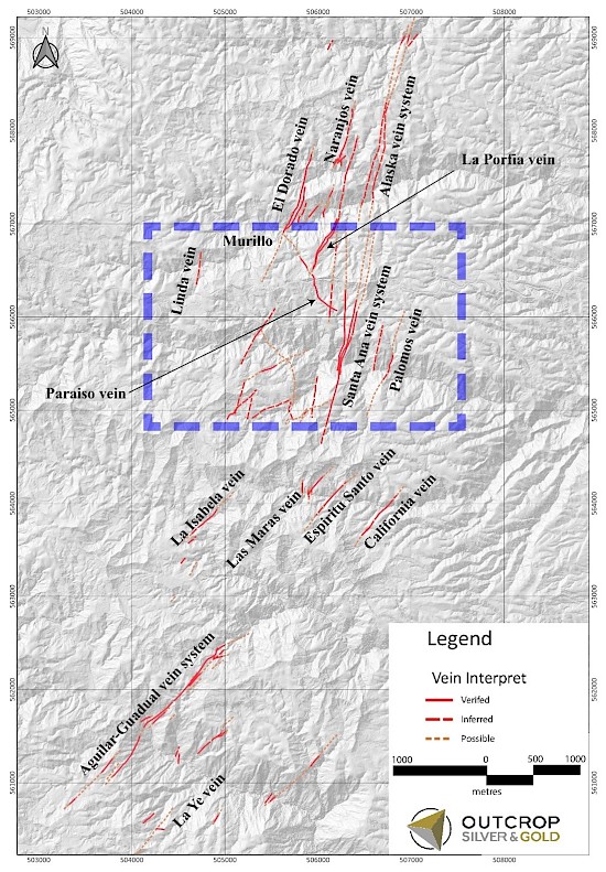 Veins with similar high grade and thickness exist along strike toward the south, forming a high-grade silver enriched trend that extends for 30 kilometres. Outcrop Silver’s exploration team has identified numerous additional veins based on high-grade samples from outcrop and historical workings that have yet to be drill tested. Outcrop Silver remains focused on identifying new vein targets with high-grade potential, and adding substantially derisked mineralized silver-bearing veins that will increase the published maiden resource.