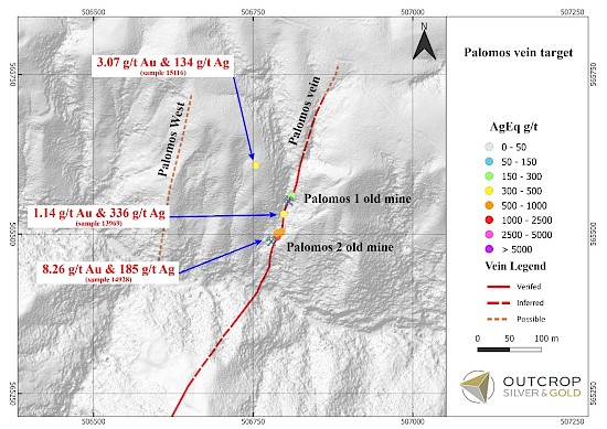 Map 3. Palomos vein target with high-grade samples included in this news release.