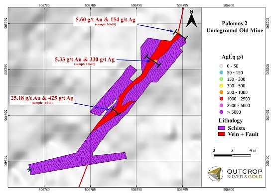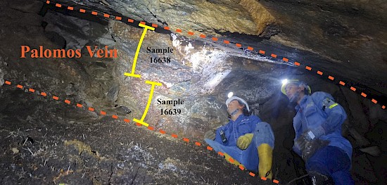 Underground channel samples in the Palomos 2 historic mine reported assays up to 25 grams per tonne gold and 495 grams per tonne silver. Related outcropping veins showed up to 8.26 grams per tonne gold and 713 grams per tonne silver (Maps 3 and 4, Figure 1 and Table 1).