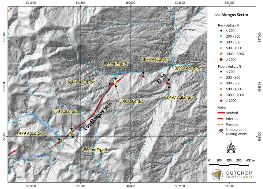 Los Mangos has a continuity of 650 metres indicated by vein outcrop, historic mines, vein float mapping, and sampling. (Map 3). Vein material from historic mine dumps shows assays of 27.71 grams gold per tonne and 9,738 grams silver per tonne. Samples from insitu quartz veins from 20 historic workings returned up to 4,545 grams silver per tonne and 1,053 grams silver per tonne (Table 1). Prior experience in Santa Ana shows that high-grade veins in workings provide targets with a high probability of success in drilling.