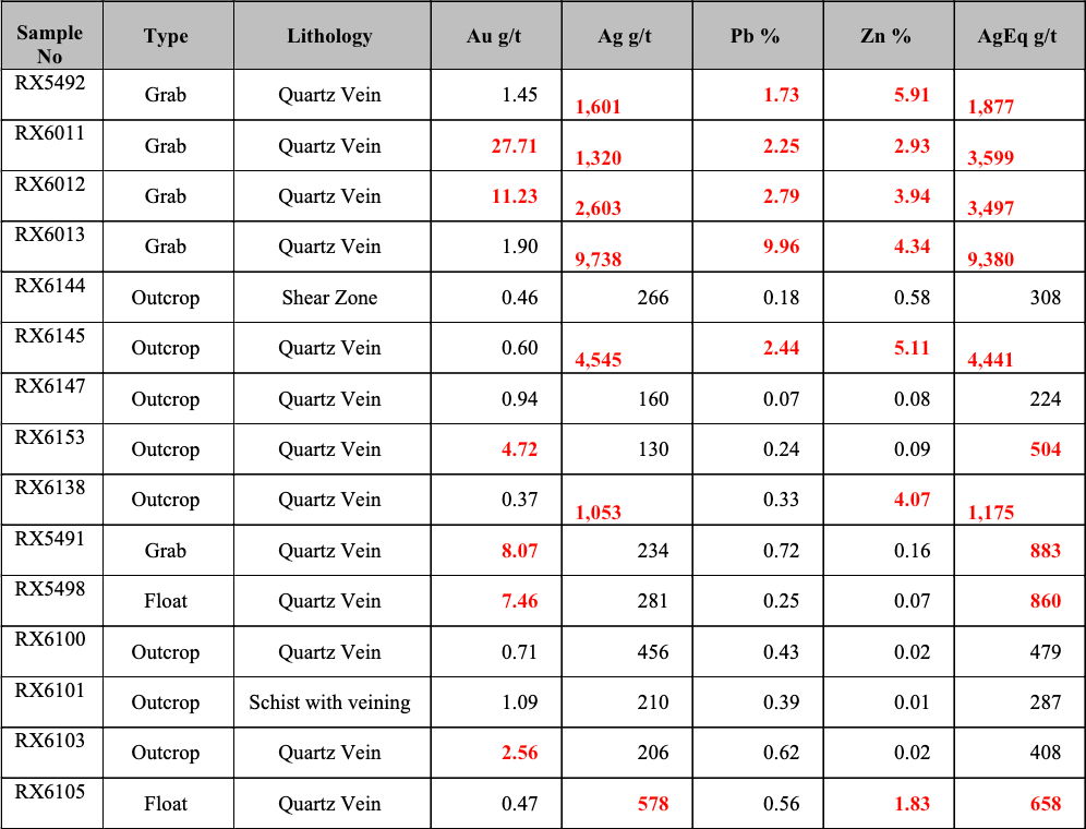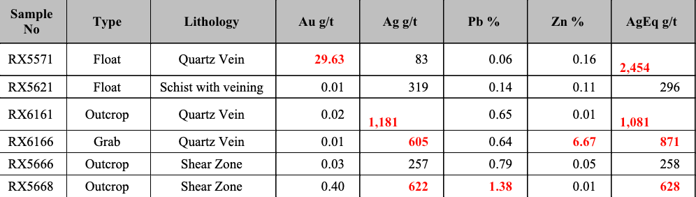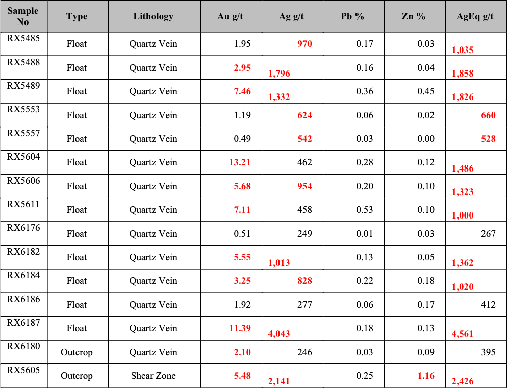 Vein float, including - near insitu boulders, shows up to 13.21 and 11.39 grams of gold per tonne. Outcropping shear zones and sheared material in float show up to 4,043 and 2,141 silver grams per tonne, respectively (Table 2). It is significant for exploration potential to see high-grade values in both veins and shear zones.