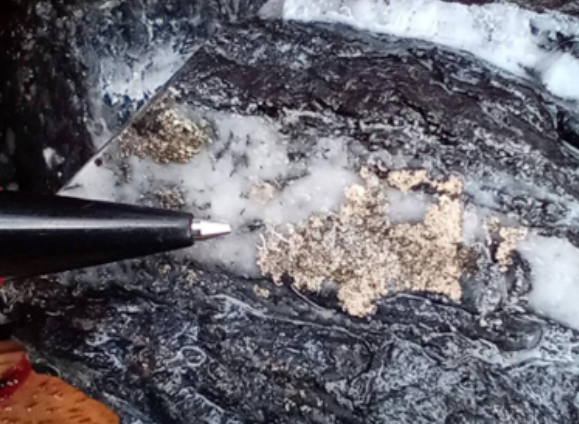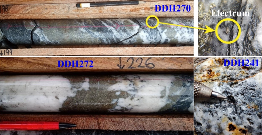 Figure 4: Abundant coarse (up to 2 cm x 1.5 cm) electrum in deeper Naranjos drill holes pending assay. This is some of the coarsest and more abundant electrum observed in core to date. Coarse electrum generally correlates with high-grade assays.