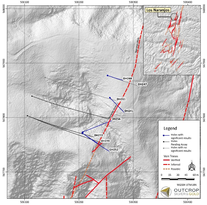 Outcrop Silver & Gold Corporation (TSXV:OCG, OTCQX:OCGSF, DE:MRG1) (“Outcrop”) is pleased to announce the results from six core holes designed to test the Naranjos structure on its 100% owned Santa Ana high-grades silver project in Colombia. The Naranjos vein is a parallel vein between the Santa Ana vein system 350 metres to the east, and the Eldorado vein system 350 metres to the west. Naranjos commonly hosts native silver and silver-rich electrum. Thirteen drill holes have been completed to date. Six returned high-grade assays and four holes have assays pending. Naranjo is open in all directions.
