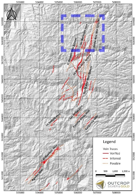 At the core Royal Santa Ana project, located at the northern extent of just one of the regional vein systems controlled by Outcrop, thirteen high grade shoots have been discovered – La Ivana hanging-wall and footwall (La Porfia vein system); San Antonio, Roberto Tovar, San Juan, Las Maras (Royal Santa Ana vein systems); El Dorado, La Abeja (El Dorado vein systems); Megapozo, Paraiso (El Paraiso vein system); Espiritu Santo (Aguilar vein system); La Isabela and Los Naranjos. Each zone commonly contains multiple parallel veins. The veins can show both high-grade silver and high-grade gold mineralization and low angle veins appear to connect more common high angle veins.