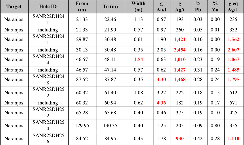 - DH241 in Naranjos returned 0.61 metres at 1,562 grams equivalent silver per tonne.