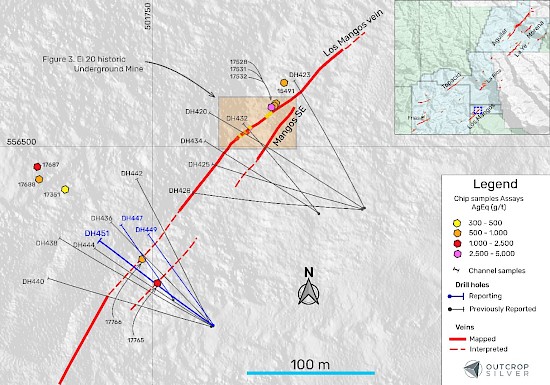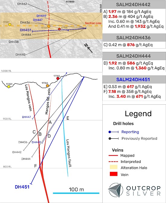 April 1, 2025 – Outcrop Silver & Gold Corporation (TSXV:OCG, OTCQX:OCGSF, DE:MRG) (“Outcrop Silver”) is pleased to announce the results from drill hole DH451 in the recently announced Los Mangos discovery at its 100% owned Santa Ana high-grade silver project in Colombia. Hole DH451 intercepted 7.18 metres at 358 g/t AgEq, including a high-grade portion of 3.40 metres at 671 g/t AgEq, marking one of the area’s most significant intercepts to date. Additionally, at 110 metres depth the hole intersected 0.53 meters at 617 g/t AgEq at the Mangos fault, showcasing the potential of fault-related structures within the vein system to host high-grade mineralization. This vein intercept, located approximately 200 meters below the surface, confirms the vein system’s vertical continuity and robustness (Figure 2). Outcrop Silver is continuing to drill this promising target.