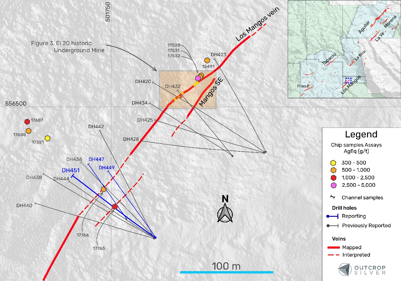 Figure 1. The plan view of the Los Mangos vein target shows the drill holes reported in this release (Table 1), and surface exploration samples (Table 2). Hole DH447 intercepted a vein with No Significant Results, while hole DH449 encountered a void. No Significant Result means an intercept lower than 200 g/t AgEq.