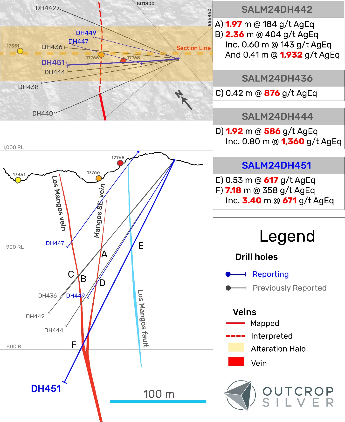 April 1, 2025 – Outcrop Silver & Gold Corporation (TSXV:OCG, OTCQX:OCGSF, DE:MRG) (“Outcrop Silver”) is pleased to announce the results from drill hole DH451 in the recently announced Los Mangos discovery at its 100% owned Santa Ana high-grade silver project in Colombia. Hole DH451 intercepted 7.18 metres at 358 g/t AgEq, including a high-grade portion of 3.40 metres at 671 g/t AgEq, marking one of the area’s most significant intercepts to date. Additionally, at 110 metres depth the hole intersected 0.53 meters at 617 g/t AgEq at the Mangos fault, showcasing the potential of fault-related structures within the vein system to host high-grade mineralization. This vein intercept, located approximately 200 meters below the surface, confirms the vein system’s vertical continuity and robustness (Figure 2). Outcrop Silver is continuing to drill this promising target.