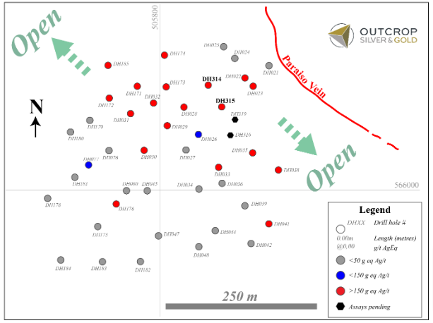 Outcrop Silver has three core rigs active at Santa Ana, completing approximately 1,800 metres per month focused on expanding known high-grade shoots and greenfield target testing. Assay results will be received regularly.