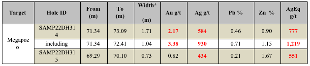 - Megapozo comprises an average true thickness of 0.80 metres at a weighted average grade of 1,068 grams equivalent silver per tonne over 19 drill holes.