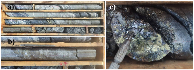 Figure 1. DH317 intercept within Las Abejas shoot. (a) Core intercept of El Dorado vein. (b) High-grade core interval with abundant silver, lead, and copper sulphides. (c) Acanthite (silver-rich sulfide) within Las Abejas shoot.