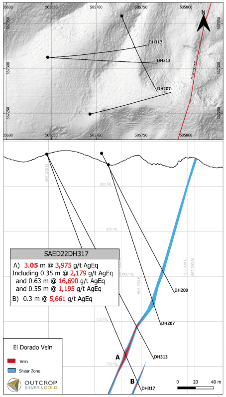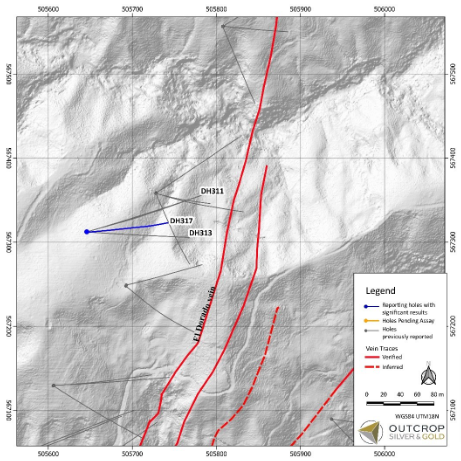 “An outstanding assay with more than 71 grams per tonne of gold and 11,088 grams per tonne of silver from DH317 reinforces extremely high silver and gold potential in the Santa Ana vein system and shows the consistent distribution of high-grade mineralization within “ore” shoots,” commented Guillermo Hernandez, Vice President of Exploration. “Drilling the exciting Las Abejas shoot at depth confirms an important exploration vector that indicates a general “top of ore” below 750 absolute elevation.”