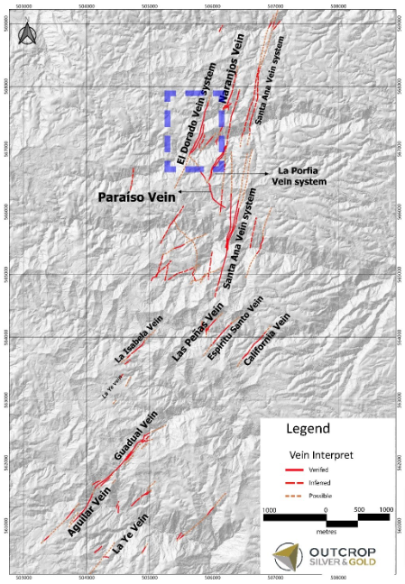 At the core Royal Santa Ana project, located at the northern extent of just one of the regional vein systems controlled by Outcrop Silver, thirteen high-grade shoots have been discovered to date – La Ivana hanging-wall and footwall (La Porfia vein system); San Antonio, Roberto Tovar, San Juan (Royal Santa Ana vein systems); Las Maras (Las Penas vein system); El Dorado, La Abeja (El Dorado vein systems); Megapozo, Paraiso (El Paraiso vein system); Espiritu Santo (Aguilar vein system); La Isabela and Los Naranjos. Each zone commonly contains multiple parallel veins. The veins can show both high-grade silver and high-grade gold mineralization, and low-angle veins appear to connect to more common high-angle veins.