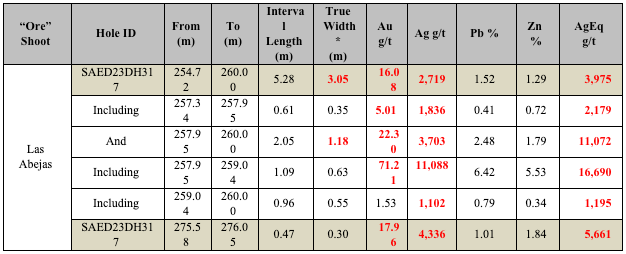 DH317 in the Las Abejas shoot intersected 3.05 metres of 3,975 grams equivalent silver per tonne, including 0.63 metres of 16,690 grams equivalent silver per tonne, the highest equivalent silver assay to date from drilling on the Santa Ana project (Table 1).