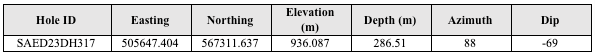 Table 2. Collar and survey table for drill holes reporting in this release.