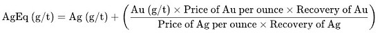 Metal prices used for equivalent calculations were US$1,800/oz for gold, and US$25/oz for silver. The equivalency formula as follows: